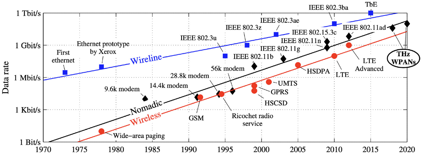 戰後無線電視與有線電視互別苗頭,同時隨著電腦間通訊的需求出現,1970 年代的 ARPANET (有線)和 ALOHA 網路(無線)開啟了接下來五十年的技術大躍進──Ethernet (有線)、AMPS (無線)、光纖傳輸(有線)及行動通訊(無線)輪番上陣,形成現在的局面。